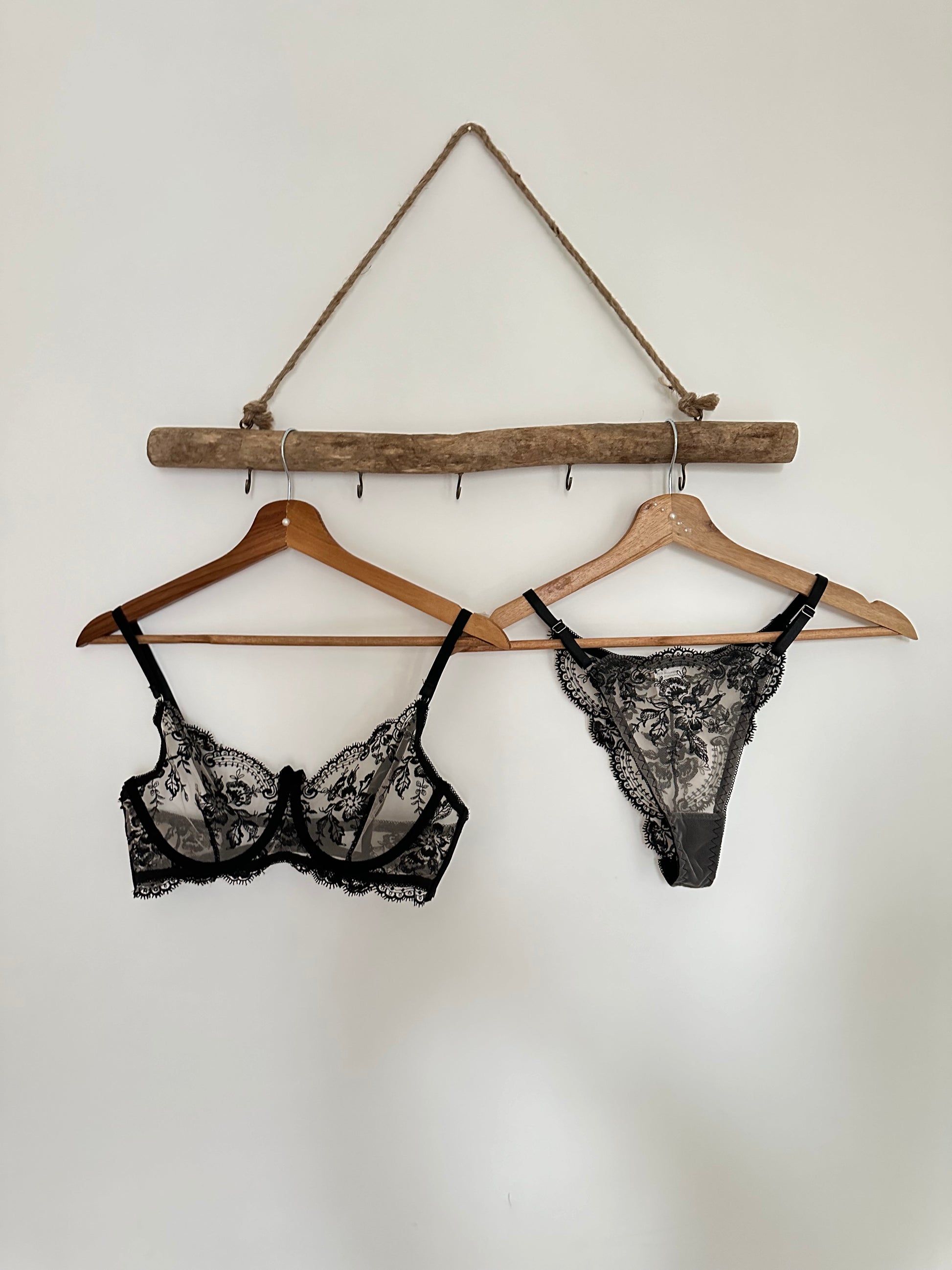 Il set Colocasia è composto da reggiseno e perizoma coordinato, entrambi adottanti da dettagli in pizzo floreale nero . Il reggiseno ha spalline regolabili e coppe con ferretto rivestite in pizzo che si estendono fino alla zona del torace. Il perizoma ha un design con pannelli in pizzo e si abbina al reggiseno.
