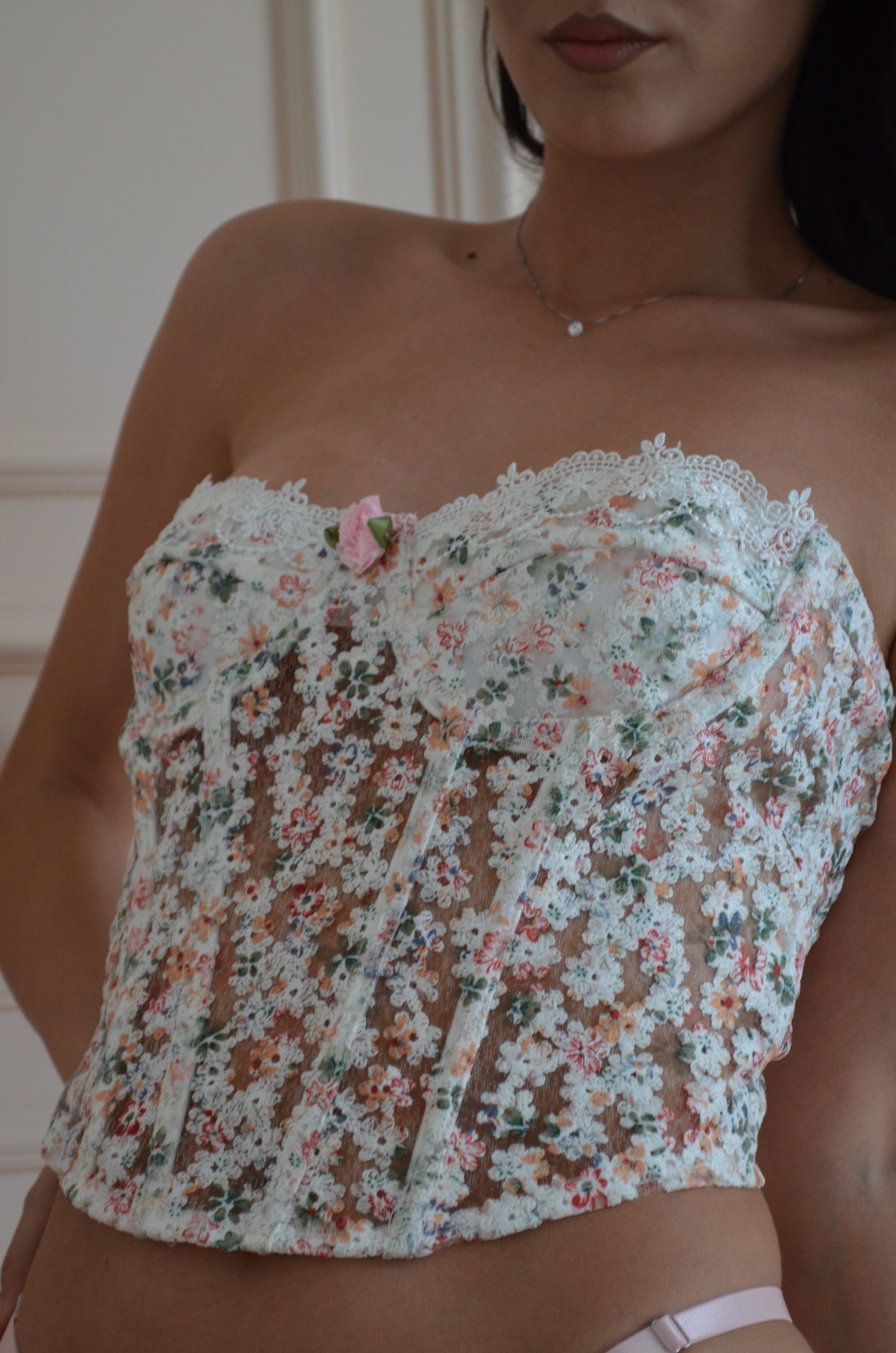 Un capo raffinato e romantico, realizzato in pizzo leggero con un delicato motivo floreale multicolore. Il taglio a bustier valorizza la silhouette, mentre il piccolo fiore centrale aggiunge un tocco di grazia e femminilità. Ideale da indossare da solo per un look audace oppure sotto una giacca per un'eleganza discreta ma seducente. Perfetto da abbinare ad un coordinato di lingerie.